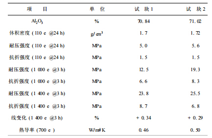 同一品種的原料體積密度較大的輕骨料,其澆注料有較高的耐壓強度和抗折強度。不同廠家的生產工藝不同,輕骨料本身的強度也有較大的差別,選擇何種原料應該通過檢驗澆注料試塊來決定。輕質莫來石澆注料的主要技術指標見表2。