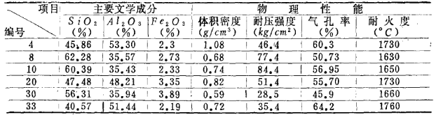 配方的選擇:以漂珠為主要原料,加入不同量軟質(zhì)粘土,并用高鋁礬土來(lái)調(diào)節(jié)制品的含量,再加入少量鋸木屑及 其它添加劑,通過(guò)試驗(yàn)尋求體積密度分別為0.5、0.6、0.7、0.8、0.9及l(fā).Og/cm3的各種配方。經(jīng)試驗(yàn)篩選出6個(gè)較理想的配方。 試制的樣品呈淡黃或深黃色,表面致密,沒有裂紋,強(qiáng)度較高。試樣主要技術(shù)指標(biāo)列于表3。