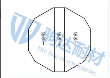 隨著近年來電熔窯逐漸向大熔化面積(熔化面積大于20m2)發展方向,對于吊碹的設計也提出了新的挑戰。吊碹面積加大意味著重量增加,為了保證吊碹的可重復利用因此獨創了分體吊碹結構,圖1為國內某廠家設計的21m2電熔窯吊碹拆分示意圖,將碹體分為3部分,每部分獨立承重在裝卸時可單獨拆分吊裝。