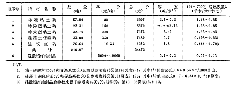 1.8米平拉退火窯用磚量和價格概算值及主要參數對照表