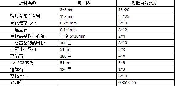 通過選用具有多孔結構的輕質莫來石骨料、氧化鋁空心球和導熱系數較小的含鋯高鋁耐火纖維, 達到提高爐輥保溫性能, 減少冷卻水帶走的熱損失, 同時降低體積密度, 減少爐輥的重量與轉動的動力消耗的目的;通過0.1~1 mm的焦寶石的加入, 彌補了小于1 mm輕質骨料性能劣化的不足, 并通過焦寶石優良的熱震穩定性與高溫性能, 提高了澆注料的綜合使用性能;通過使用水泥、二氧化硅和-Al2O3微粉作為復合結合劑, 引入水合結合和凝聚結合兩種凝結硬化機理, 提高材料的低、中和高溫強度;通過加入少量鋰輝石粉的燒結促進作用, 改善澆注料使用條件下的燒結狀況, 促進爐輥澆注料隔熱襯使用條件下高溫陶瓷結合相的形成, 提高隔熱襯的抗破損能力;通過添加含鋯高鋁耐火纖維, 利用其在基體中的拉拔作用所產生的增強、增韌效應, 提高爐輥澆注料抗機械振動能力和抗沖擊韌性;通過添加藍晶石粉作為膨脹劑, 利用藍晶石高溫下不可逆分解為莫來石和游離的Si O2而產生體積膨脹, 抵消澆注料高溫下體積收縮, 防止澆注料與金屬輥身之間熱膨脹不匹配造成的澆注料層開裂和脫落;通過減水劑、有機消泡劑和硅烷偶聯劑等外加劑的使用, 提高了澆注料的施工流動性, 降低了澆注料的加水量, 改善了爐輥澆注隔熱襯施工質量與綜合性能。